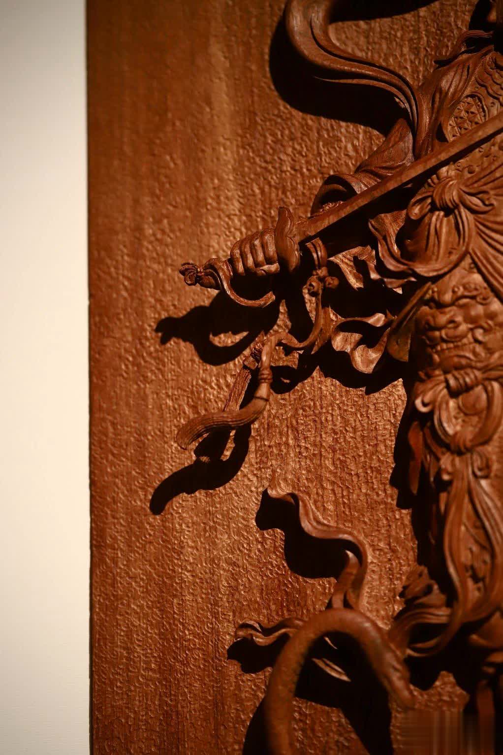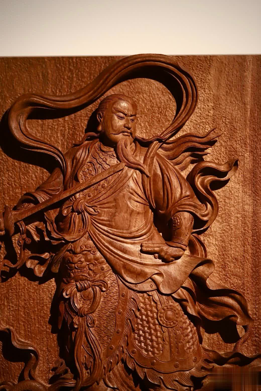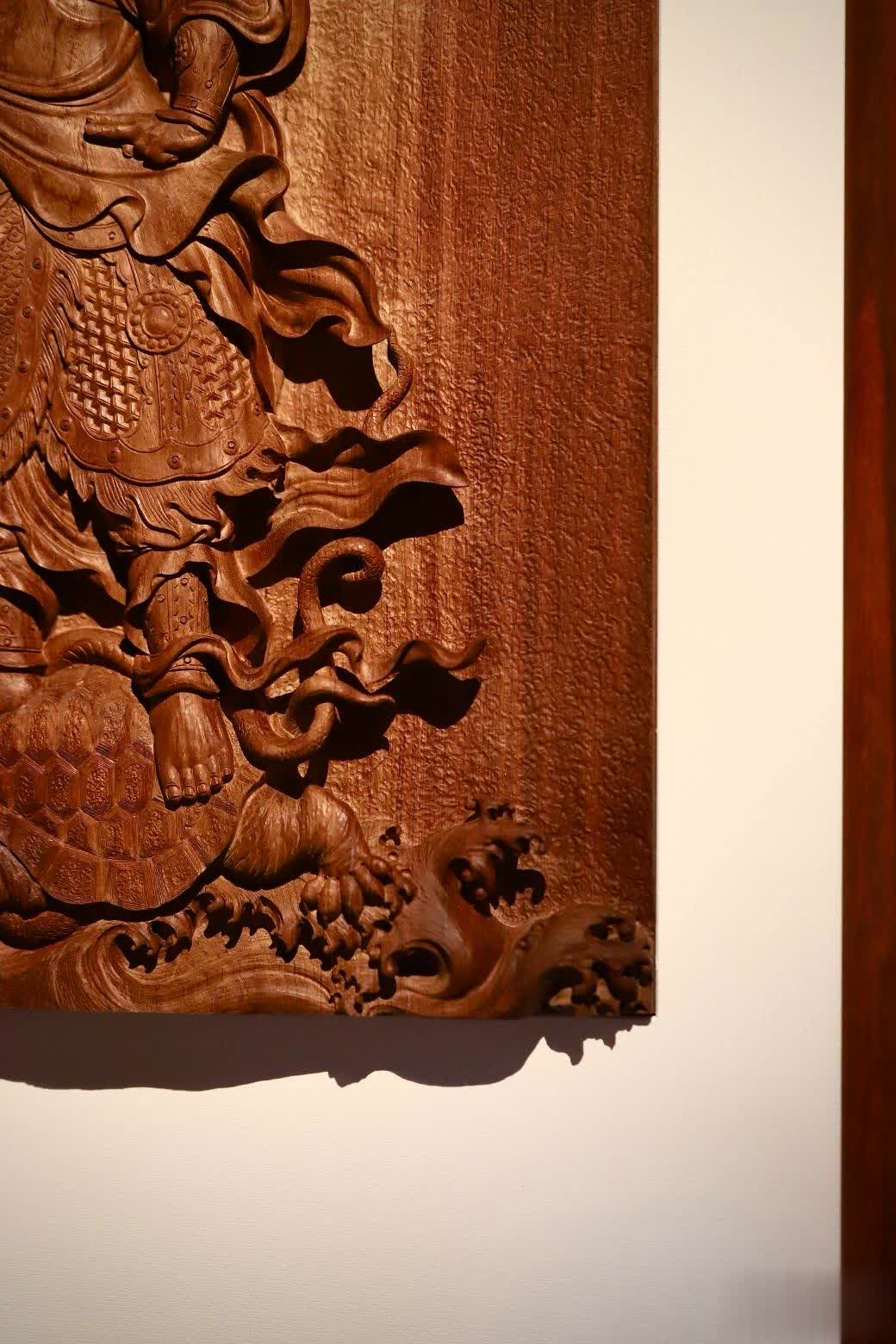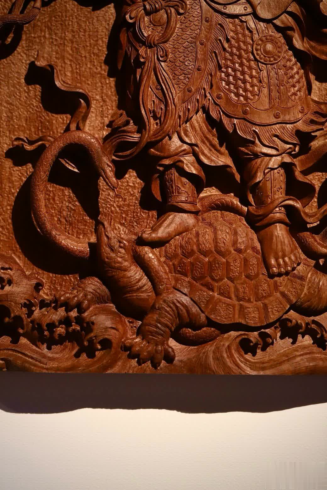 此件真武大帝挂屏,在选材方面独具匠心,选用了缅甸花梨木独板厚料,材质上乘,纹理优美。其采用铲地高浮雕雕刻技法,雕刻者刀法细致恭虔,每一刀都蕴含着对真武大帝的敬畏与尊崇之情。