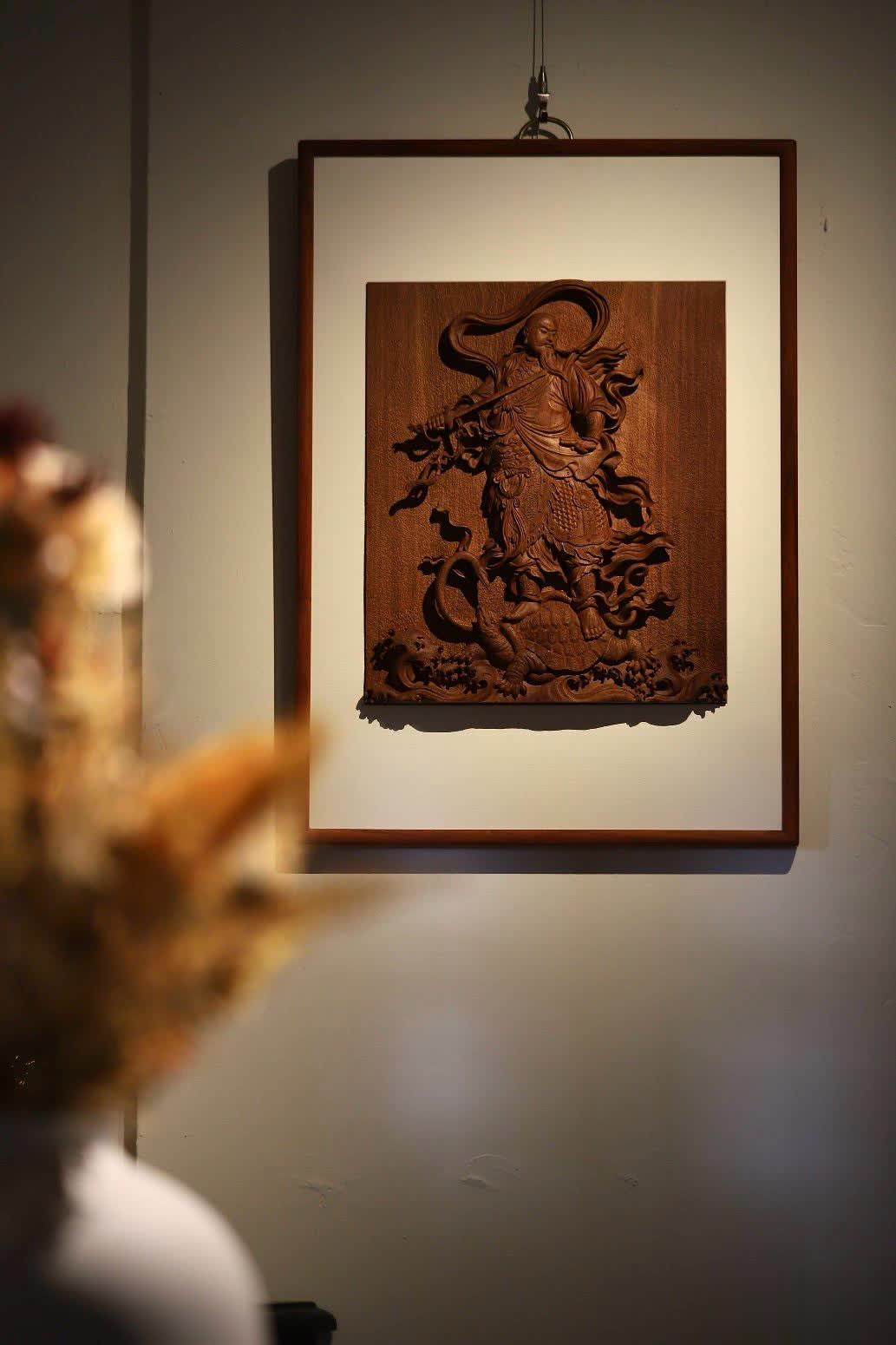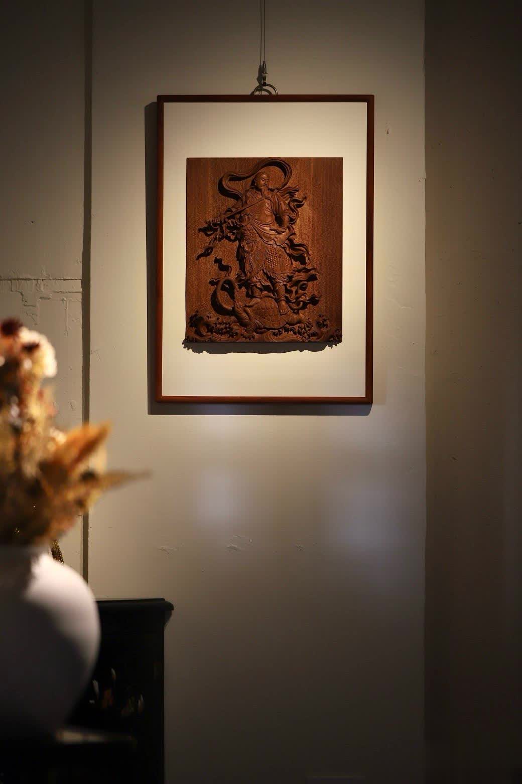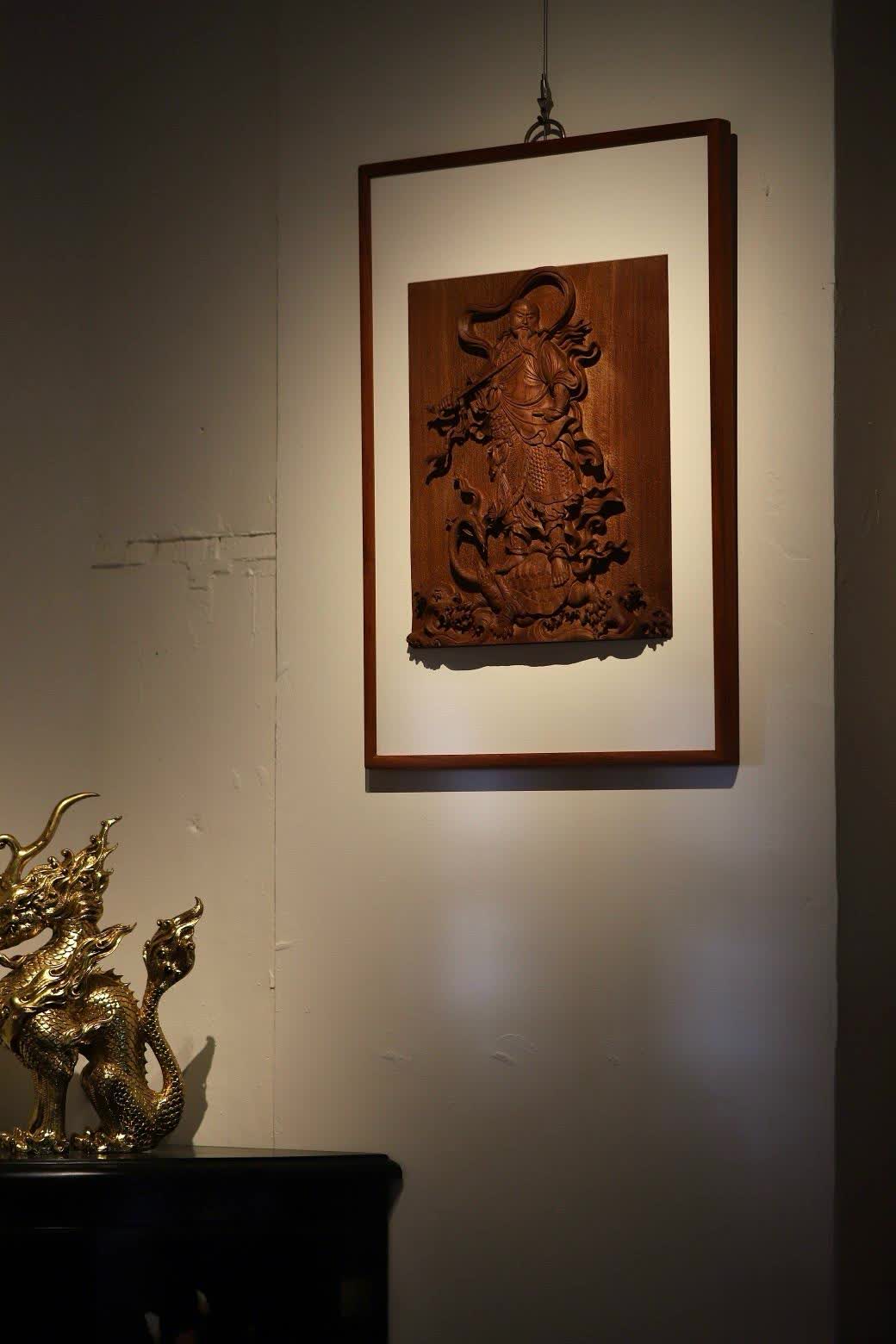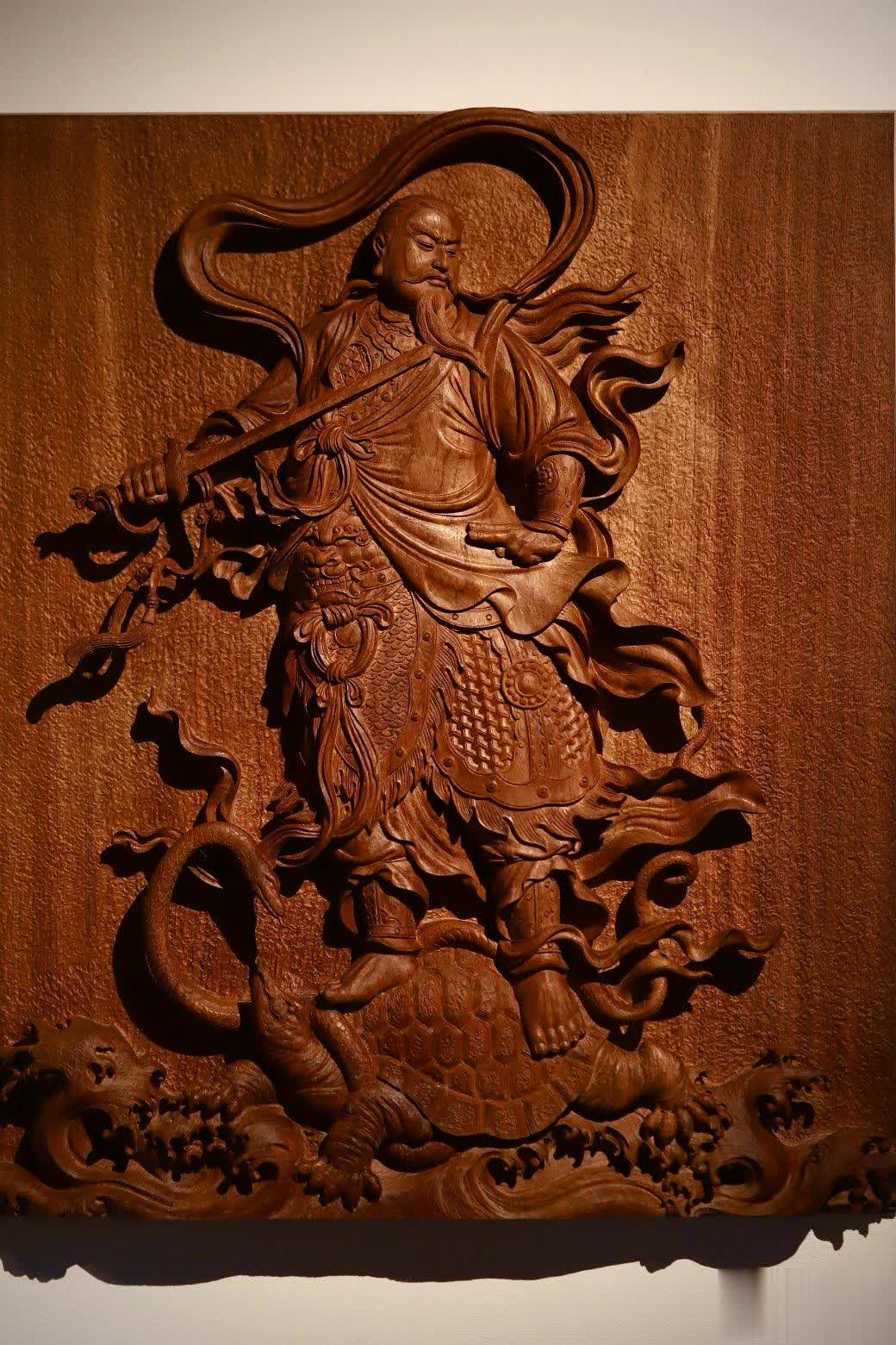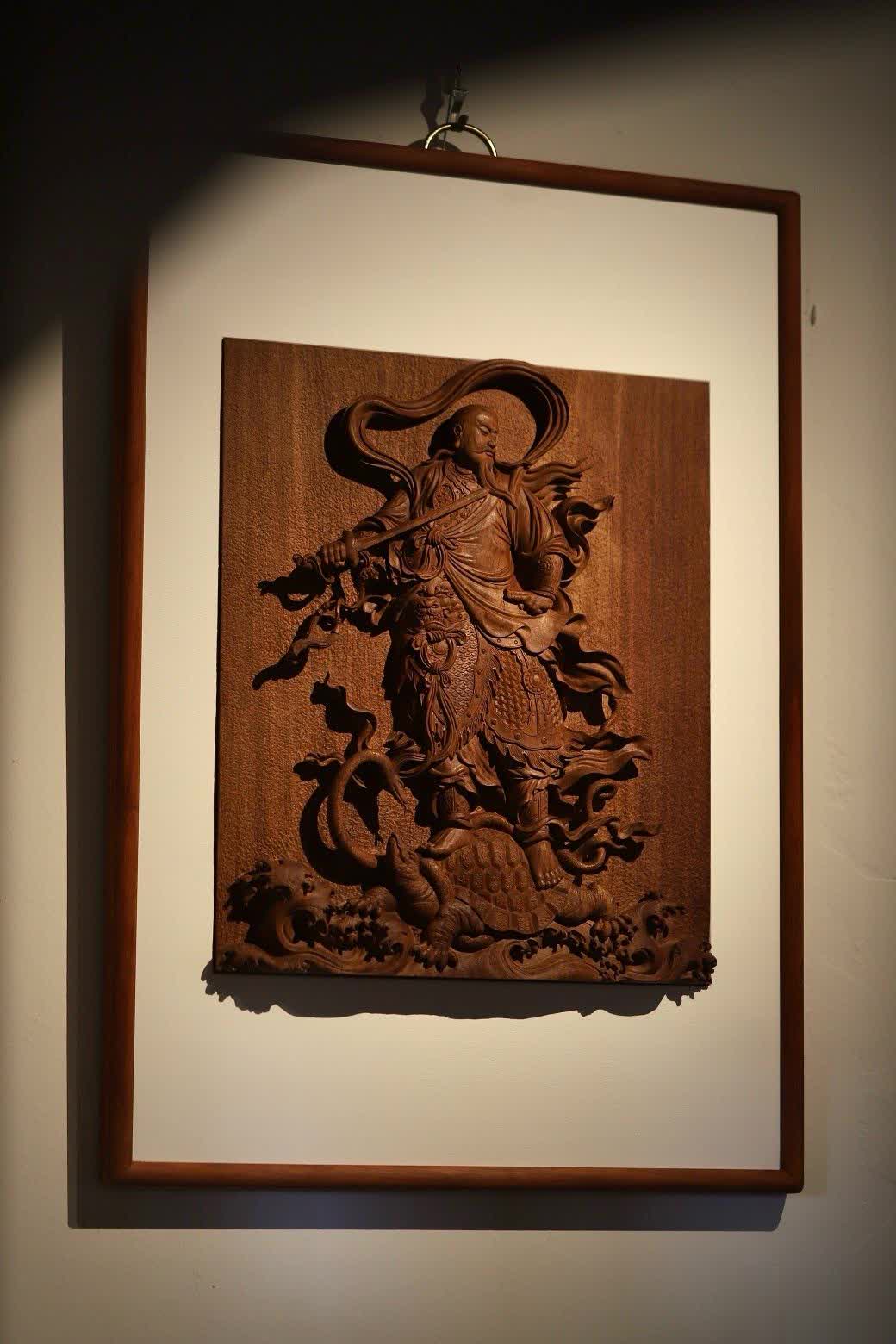 此件真武大帝挂屏,在选材方面独具匠心,选用了缅甸花梨木独板厚料,材质上乘,纹理优美。其采用铲地高浮雕雕刻技法,雕刻者刀法细致恭虔,每一刀都蕴含着对真武大帝的敬畏与尊崇之情。
